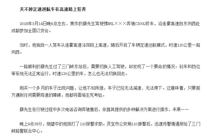 不过,报道中车主表示,行驶中多次电话咨询奔驰售后,但求助售后未果。