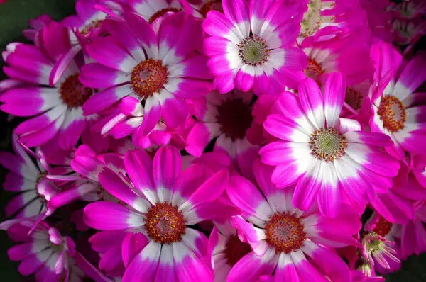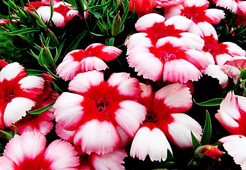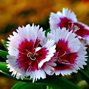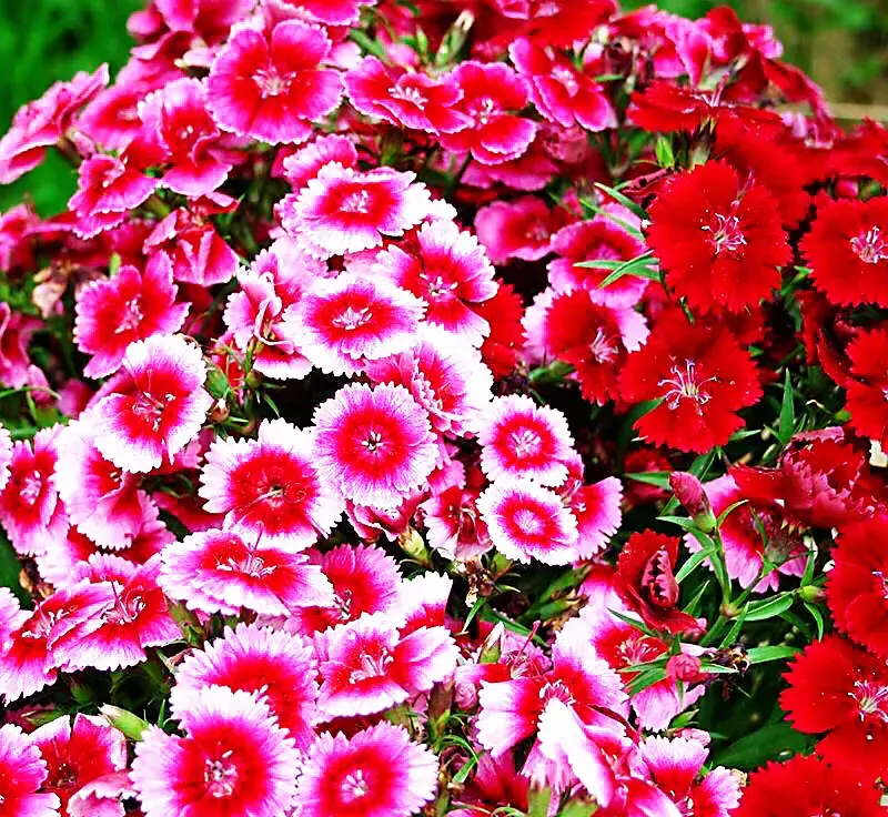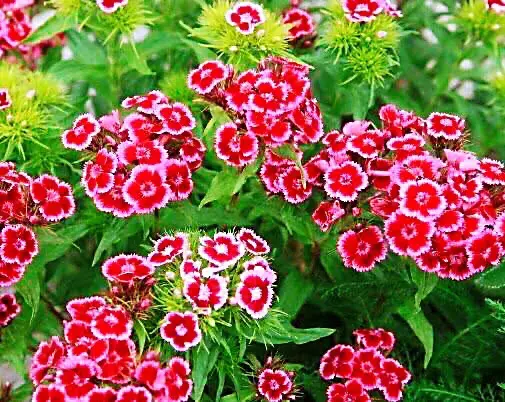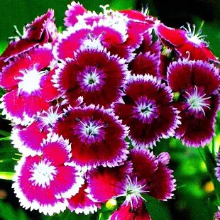 五彩石竹有粉红、鲜红、白色、紫色等等,叶片边缘参差不齐,美感十足,相互映衬,璀璨斑斓。