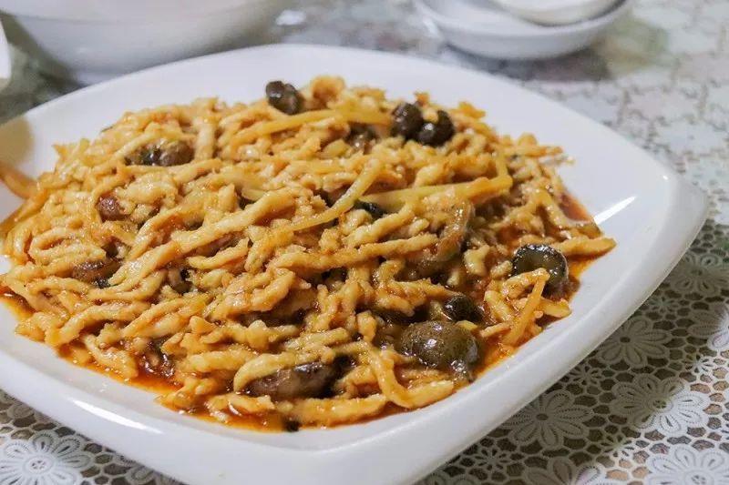 烧三丝必须算是一道地道的津菜,猪肉、笋和海参切成火柴棍的大小。临出锅要淋上一勺高汤,半勺明油,看着油亮,吃起来更细腻。