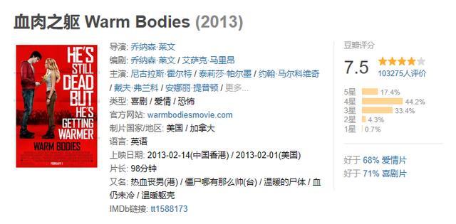 网友评价:丧尸片的种类也趋向于多元化,丧尸也可以有感情了,题材新颖。