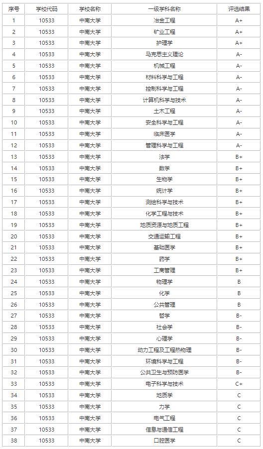 中南大学的冶金工程、矿业工程、护理学获得A+,是全国排名第1的学科。可以看出,这些学科分别来自中南大学合并前的中南工业大学(前身中南矿冶学院)和湖南医科大学(湘雅医学院)的王牌学科。