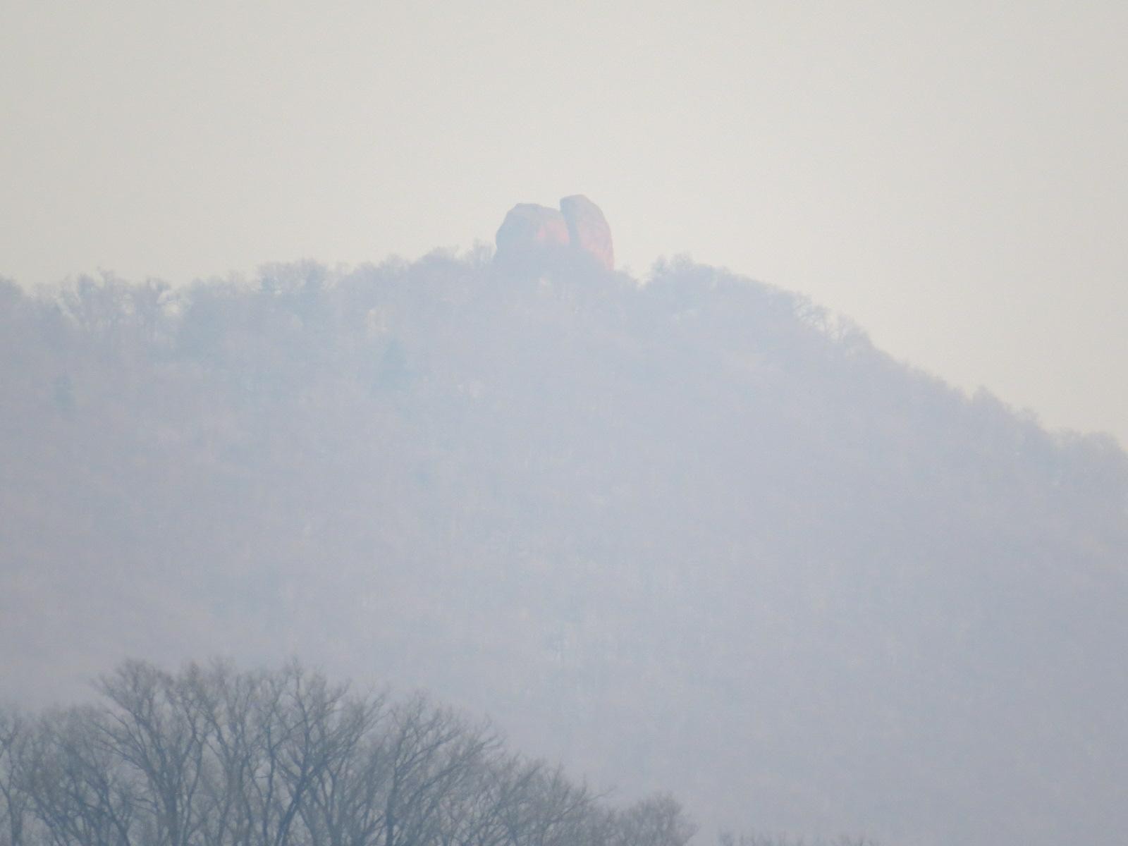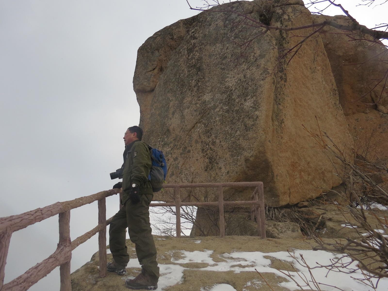 踩着动物的足迹继续往上走,就进入了核心区。核心区的树木明显比缓冲区茂盛多了,很多大树两个人抱不拢,树洞深不见底,增加了它的神秘感。枯木东倒西歪挡住了上山的路径,大雪覆盖的登山小径在树隙间左突右拐,蜿蜒向山顶延伸。终于看到密林中耸立的巨石,那就是三块石吗?分别为大三块石、中三块石和小三块石三个部分。最先遭遇的是中三块石和小三块石,中三块石是一石在下一石在上的石叠石,旁边还倚着一个石头,像一个相扑运动员突然发力将对手扛于肩上,旁边的裁判则拭目以待。小三块石则是三石并立,如武士立于山顶,目视远方。从中三块石和小三块石旁边的石阶上行300米,就来到了大三块石脚下。大三块石下面是一个巨大的石头斜面,在斜面的顶端扶栏远眺,千峰竞秀,林莽苍茫。如站在巨轮的甲板上,脚下群山起伏如大海的波涛。这不就是一艘石头版的泰坦尼克号吗?
