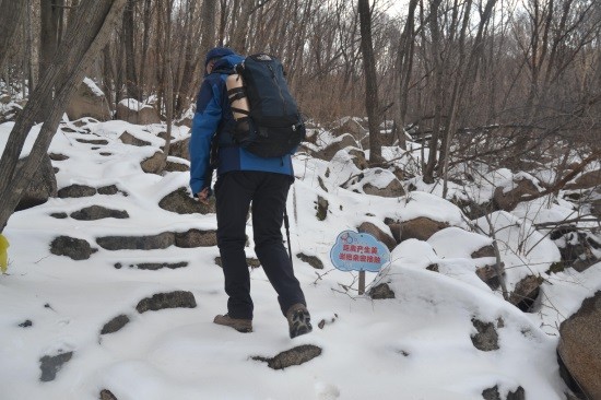 在山顶遇见了从南坡上来的一对年轻的情侣,今天整个三块石景区只有我们四个人,分别来自南北两条路线。如果我们从北坡原路返回的话,他们打算跟我们从北坡下山,到山下我们再驾车送他们回到三块石景区南门。然而当看到北坡被雪覆盖道路难行,两个年轻人又决定从南坡原路返回,这样我们就可以跟他们从南坡下山,再让他们驾车送我们回到景区北门。
