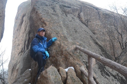 与两位年轻人同行从南坡下山。沿“九九天梯”,经过情人谷、美人浴、闻涛玉床、象树……等景点,一路拾阶而下。南坡基本没有雪,设施也比较齐全,每隔一段就会有木桌、木椅可休息。一处写着“抗联遗址”的牌子引起了我们的注意。原来这里是抗联英雄杨靖宇住过的地窨子。1934年—1938年东北人民革命军第一军军长杨靖宇率部在三块石地区建立了游击根据地 ,他们在山坡的朝阳面挖了多处的“地窨子”,里边可以睡人,又可以储藏粮食、药品。八十多年过去了,当年的地窨子或许已经被岁月湮没,但通过遗址的外观轮廓仍能看出当年的痕迹。那首《三块石的月光》,仍在当地广为流传。当我从这些遗址走过的时候,那段历史也将永驻我的心中。