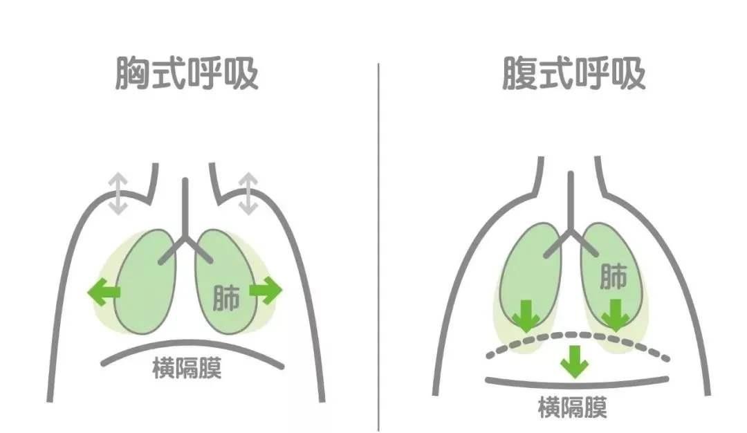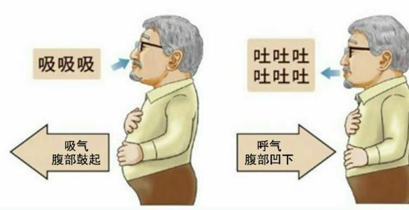 腹式呼吸:吸气时小腹鼓起,横隔膜下降,胸部鼓胀不明显;呼气时小腹内收,横隔膜抬高。