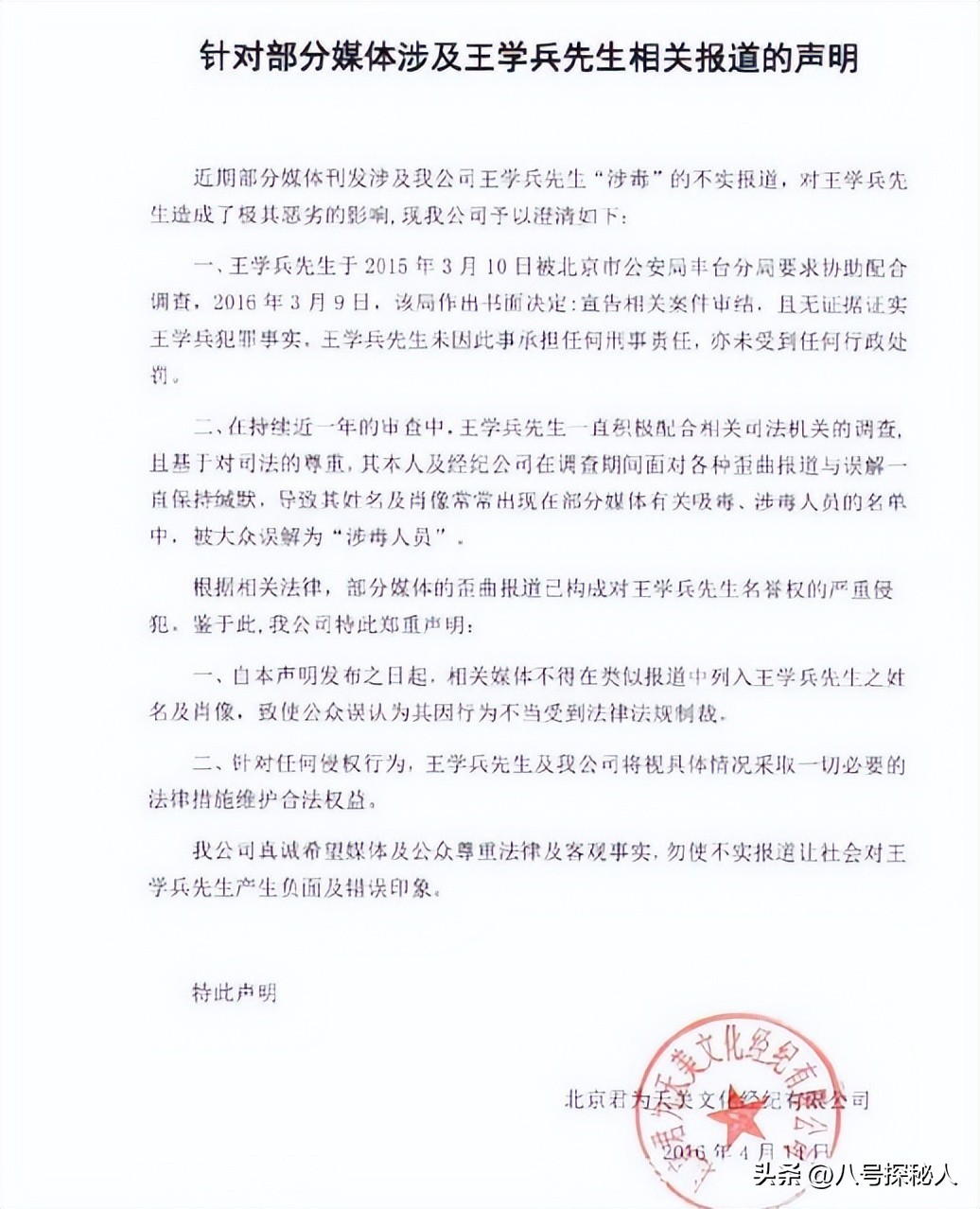 可仅仅过了半个月,王学兵便离奇地回到了家中。2016年4月王学兵的经纪公司君为天美发布声明称:经过调查后没有证据证明王学兵有吸毒事实,而他也没有受到任何行政处罚,也就是说王学兵吸毒这件事完全是个误会。