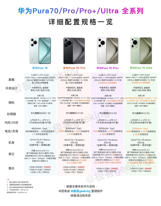 一图看懂华为Pura 70全系列如何选?详细配置参数对比!