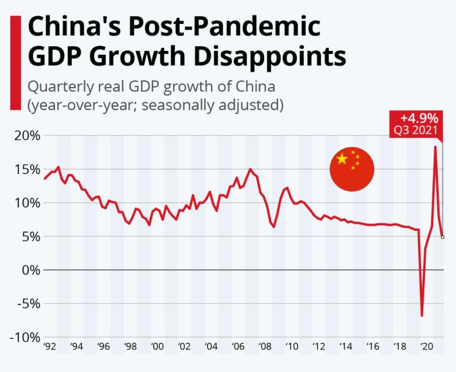 1、中国的经济增速确实在放缓。2021年第三季度国内生产总值(GDP)同比增长4.9%,低于预期,中国10月工厂活动收缩幅度超过预期,连续第二个月萎缩。10月份官方制造业采购经理人指数为 49.2,低于 50 的水平。