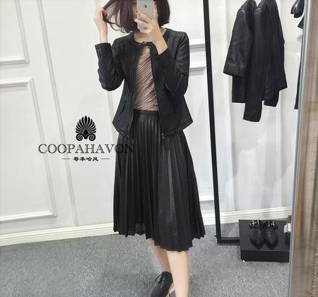 圆领款的皮夹克,带有欧美范儿的刷漆黑色收腰款式。圆领的设计,露出整个颈部,自信、大方,凸显身材。