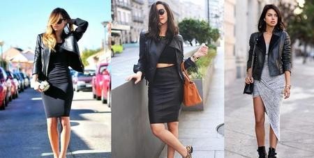 包臀裙性感又职业,跟黑色皮夹克搭配,能恰好将包臀裙的那种有些轻浮的感觉去掉,勾勒完美身型的同时,可以端庄优雅,可以时髦帅气。