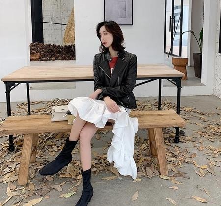黑色机车款皮夹克,内搭雪纺连身裙,可爱而迷人,凸显女生身材的同时,让女生显得帅气而不失可爱的魅力。
