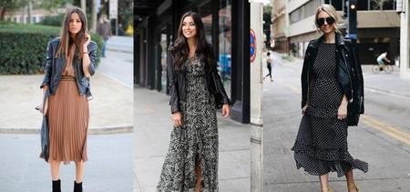 长裙的优雅柔情+皮夹克的酷感时髦,虽然感觉是两个完全性格不搭的单品,但是组合起来却是非常和谐,既可以突出女人的优雅婉约,同时又不失潮流酷感,另外这种组合特别适合春秋,内穿肉色打底裤,既保暖,整体造型又很轻盈。