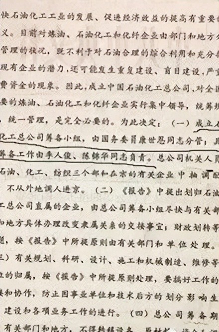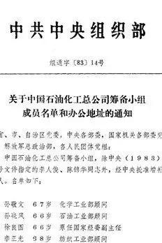 1983年2月19日,党中央、国务院“经过充分论证,下了最大决心”,决定成立跨部门、跨专业、跨地区的大型经济实体——中国石油化工总公司。组织形式为部一级经济实体,对全国原分属石油工业部、化学工业部、纺织工业部等部门管理的炼油、石油化工和化纤企业实行集中领导、统筹规划、统一管理,对产供销、人财物、内外贸实行统一管理。同时,成立中国石化总公司筹备小组,由国务委员康世恩同志分管,具体筹备工作由李人俊、陈锦华同志负责。