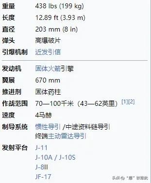 “霹雳-8”近距空空导弹由西安东方机械厂大批生产,主要装备中国空军歼10、歼11和成飞研制的外贸型枭龙战机,在实战中作用相当于AIM9M、R-73。最小射程500米,最大射程15000米。