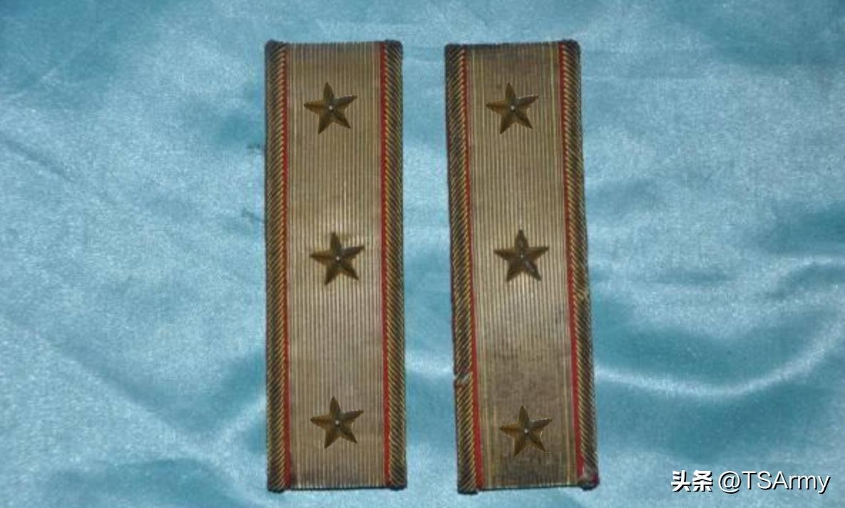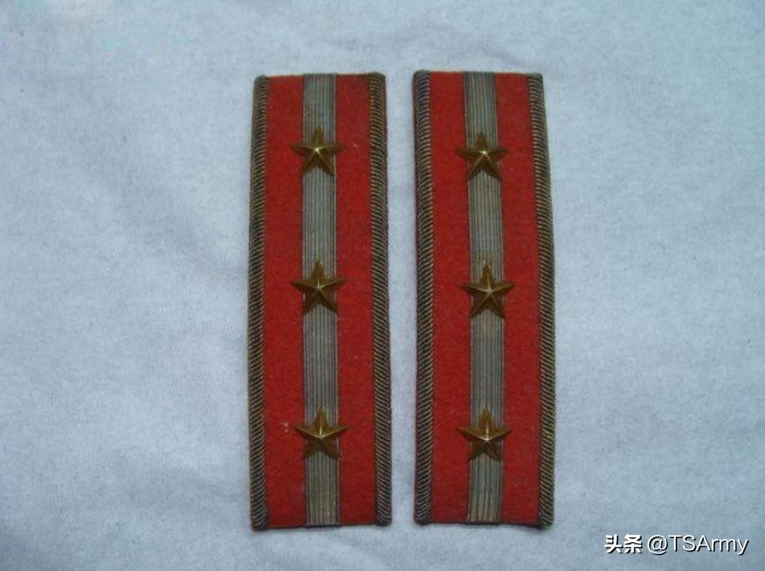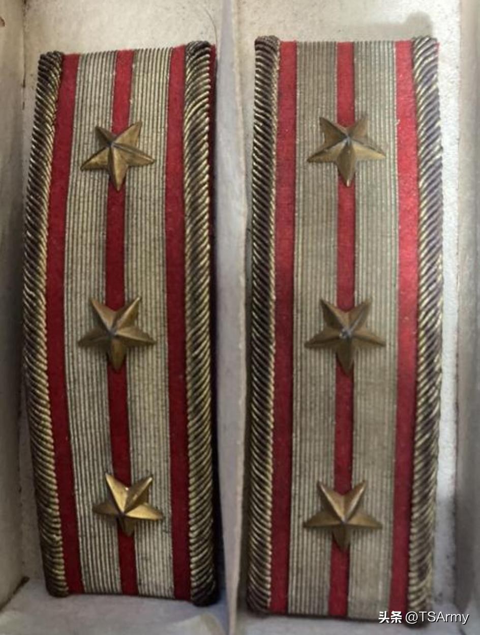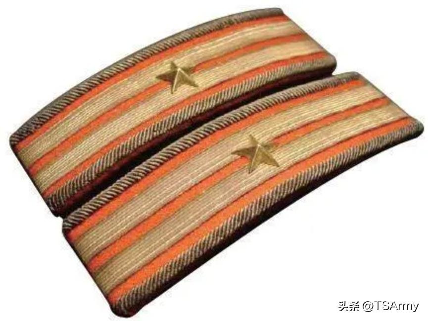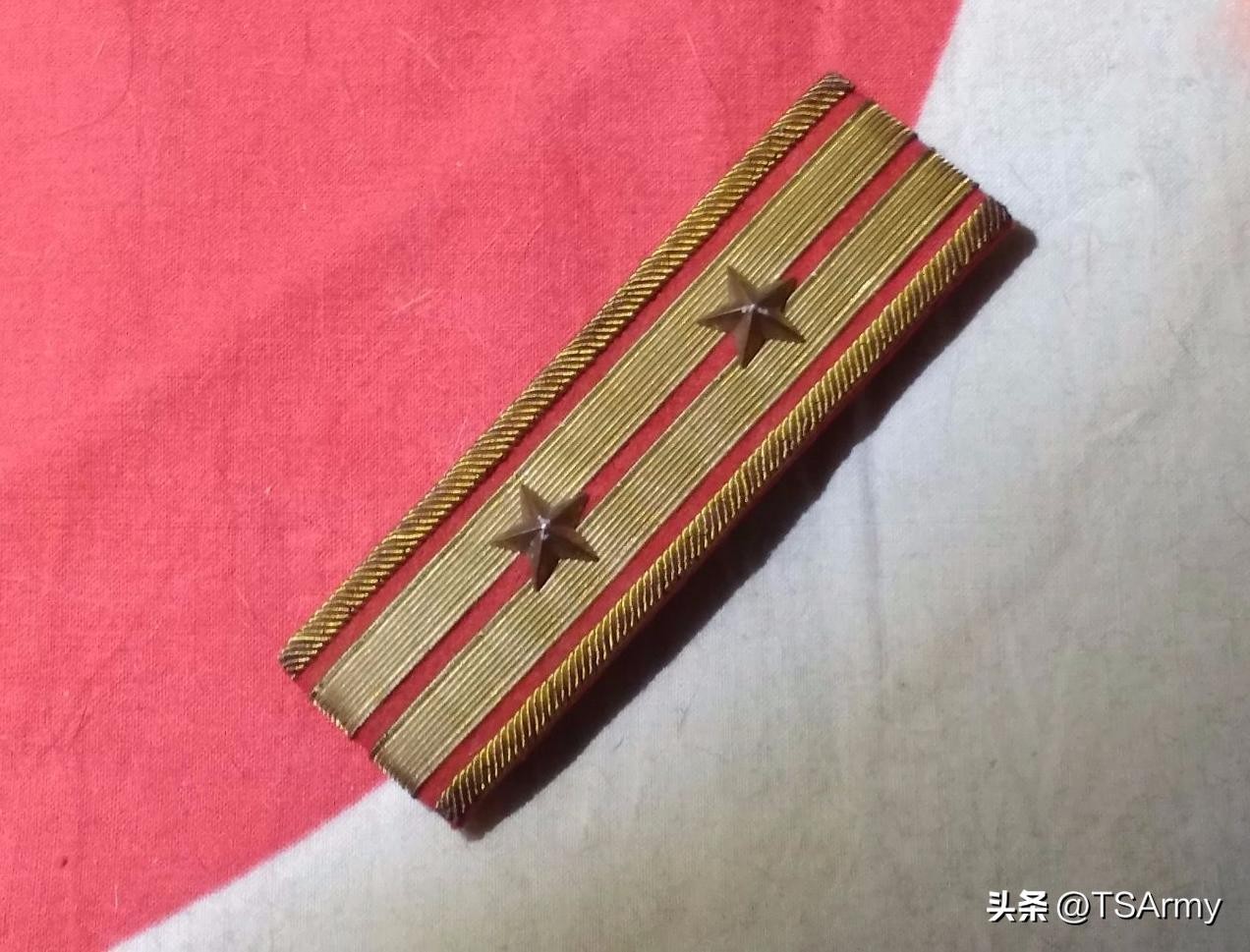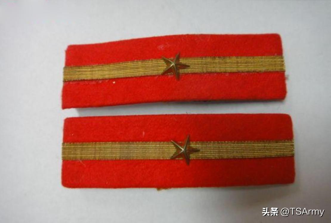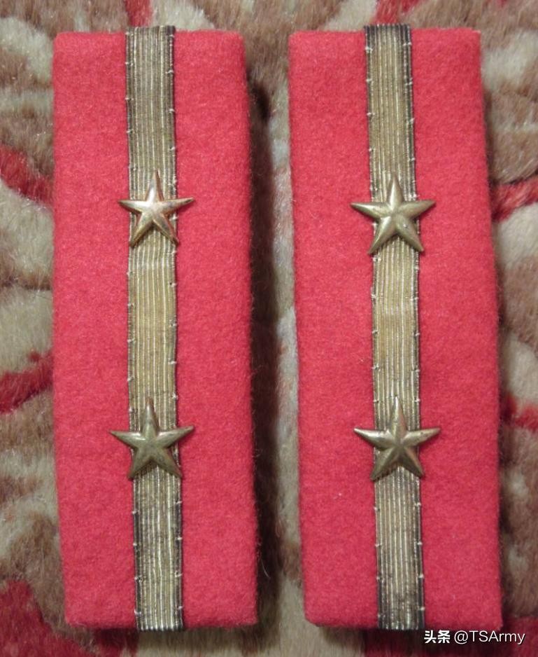 到了这个职级,军衔肩章也再一次发生变化,在红色底版的边缘两侧,增加了一条刺绣式金色牙线,然后中间的金杠颜色变淡。