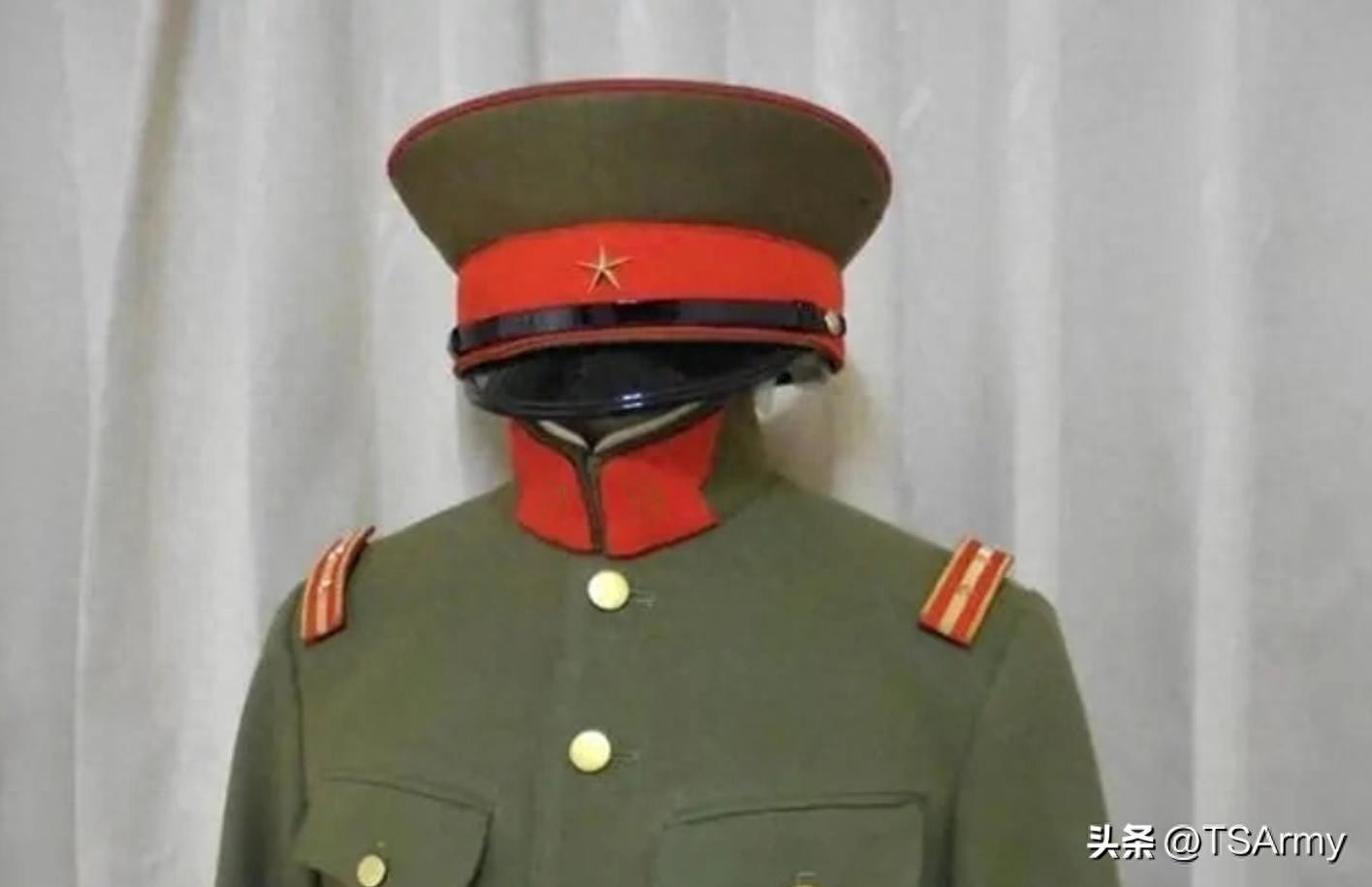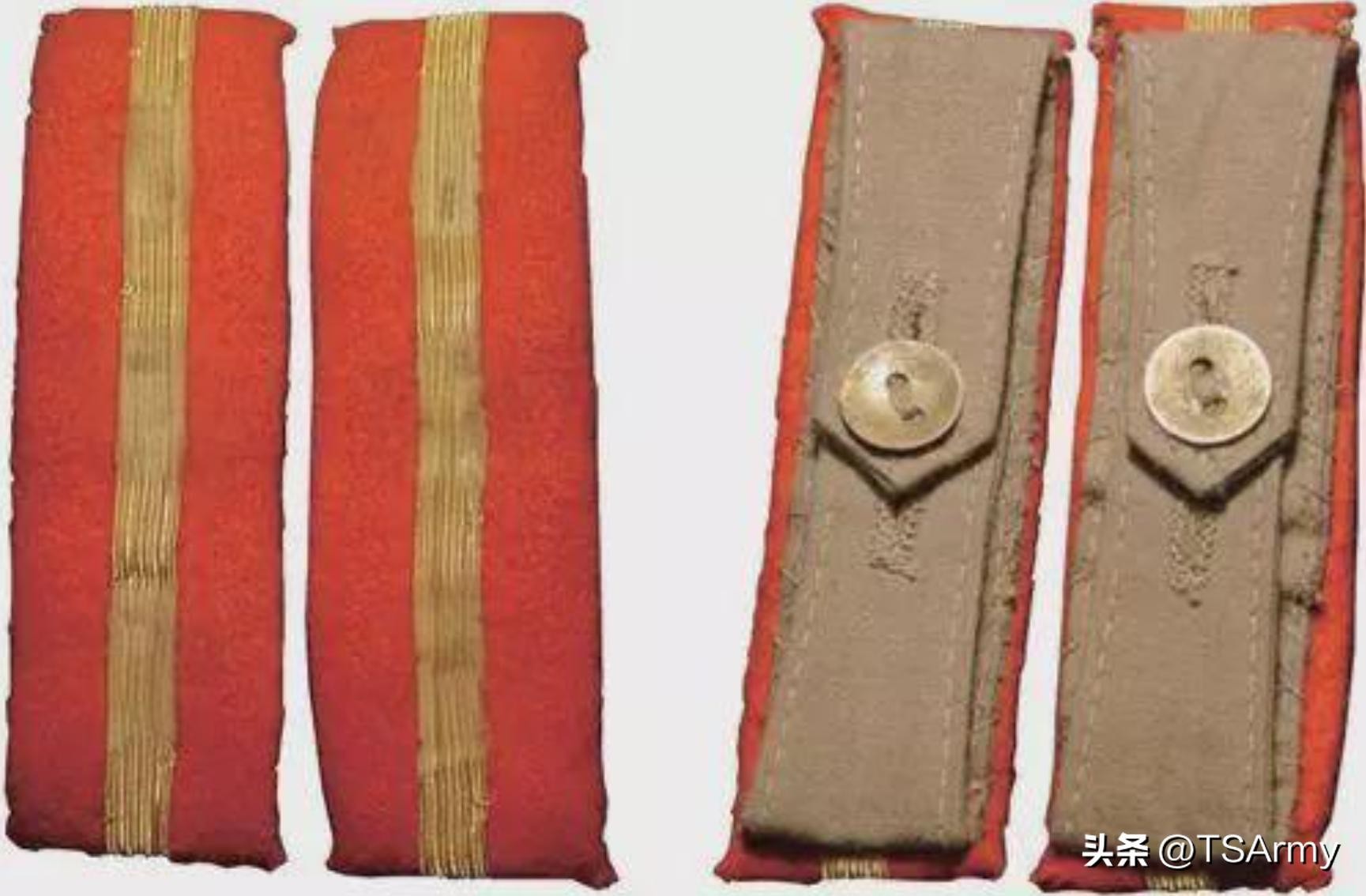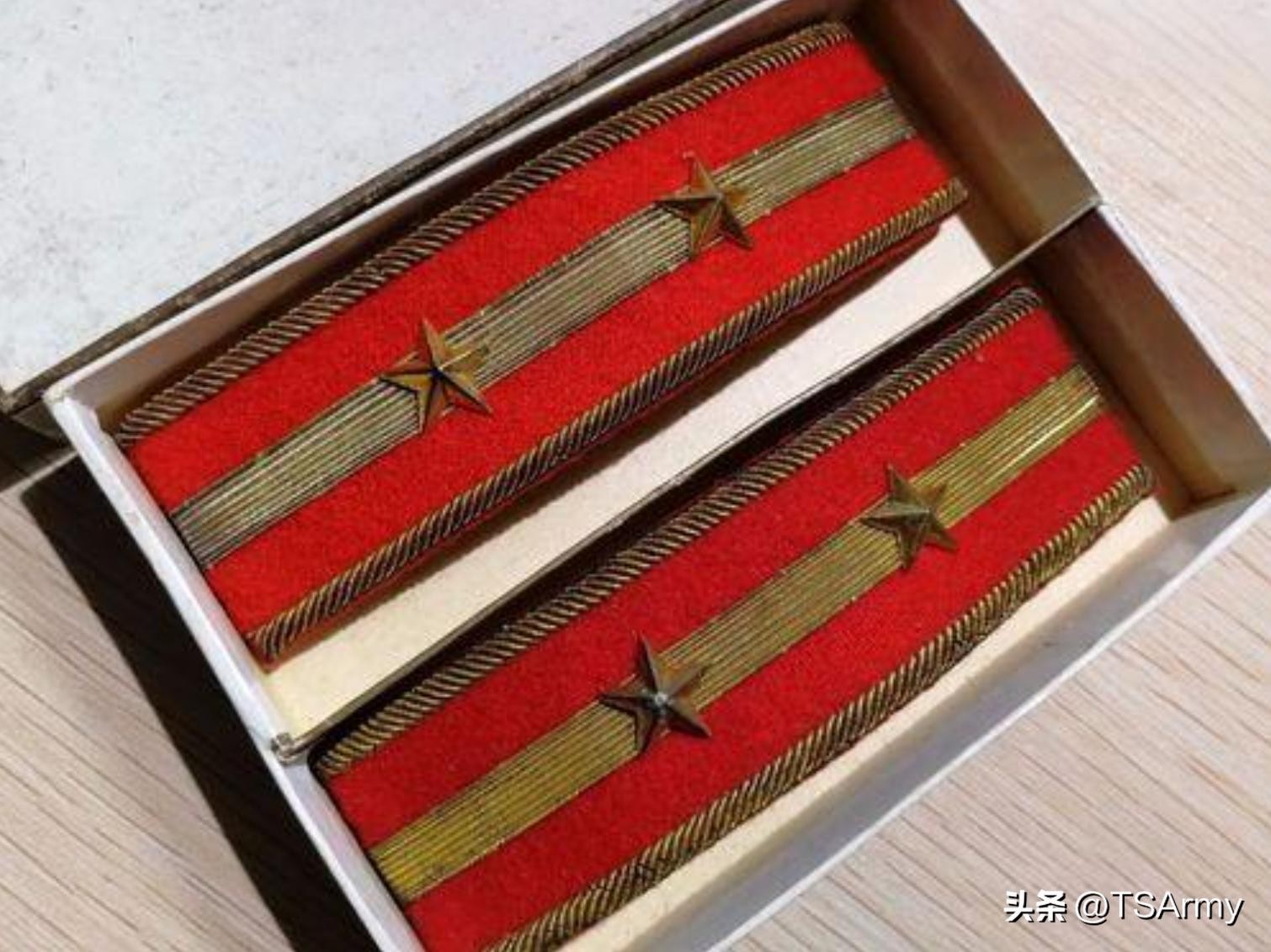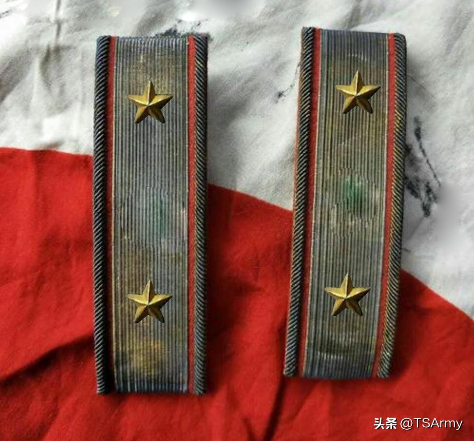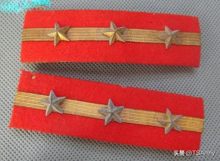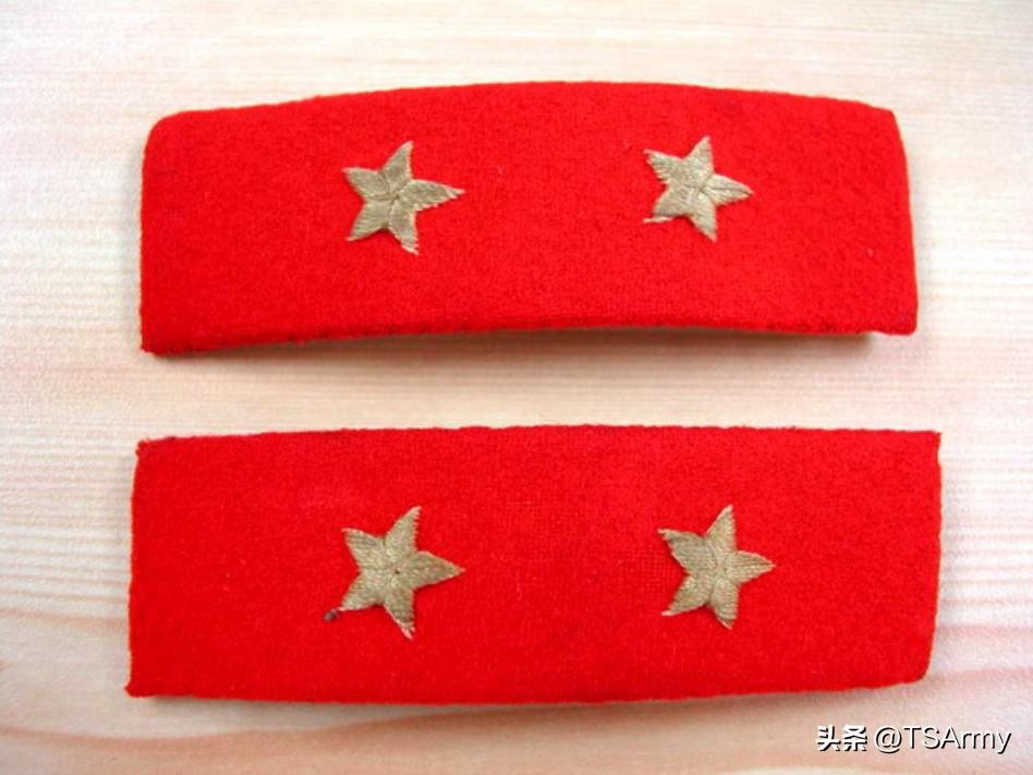 到了这个职级,军衔肩章也再一次发生变化,在红色底版的边缘两侧,增加了一条刺绣式金色牙线,然后中间的金杠颜色变淡。
