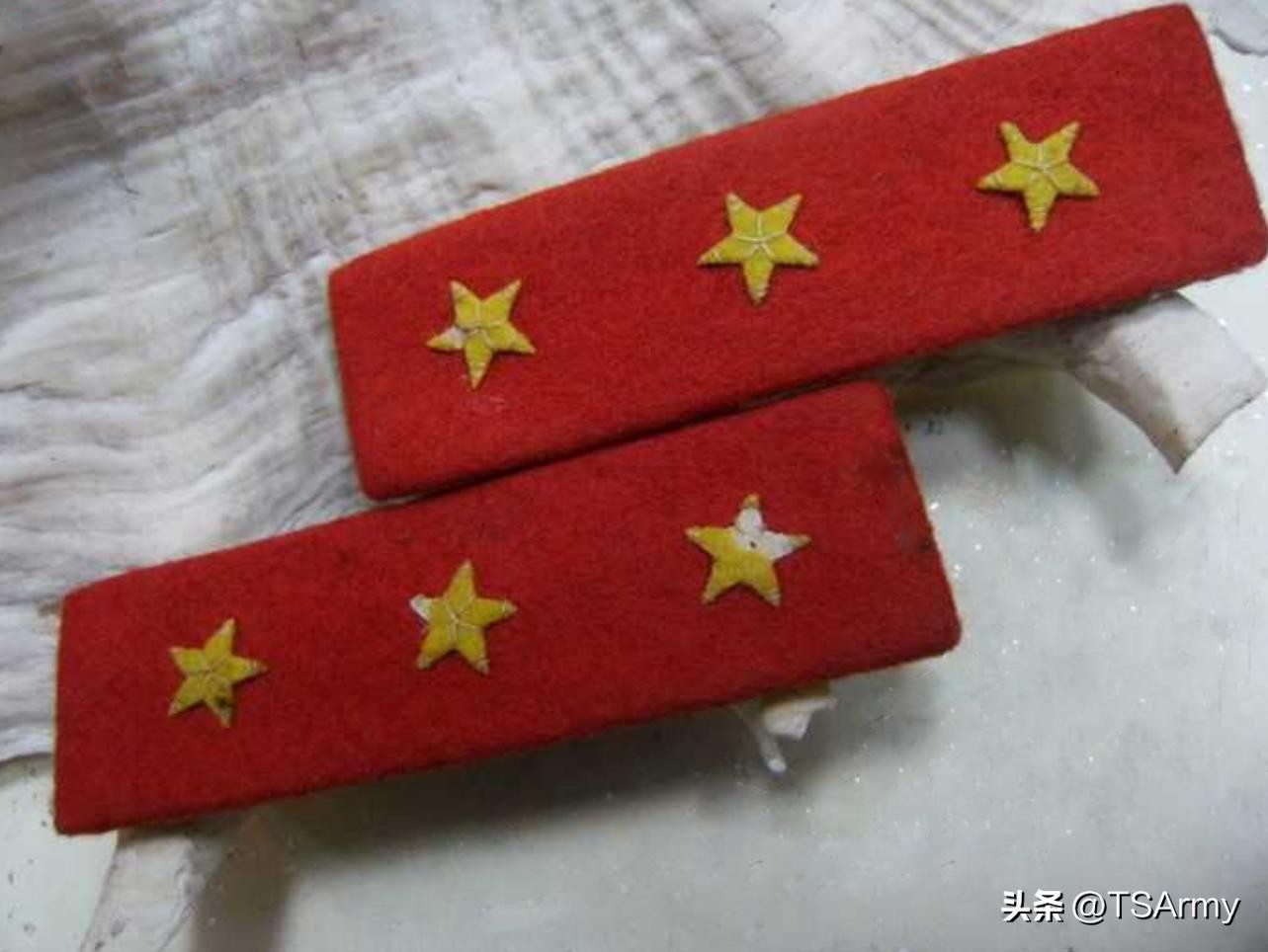 到了将军级别,军衔章又不一样了,底版直接变成了黄金色,仅保留少量的红底色,少将军衔章就是在金色底版上加了一颗五角星。