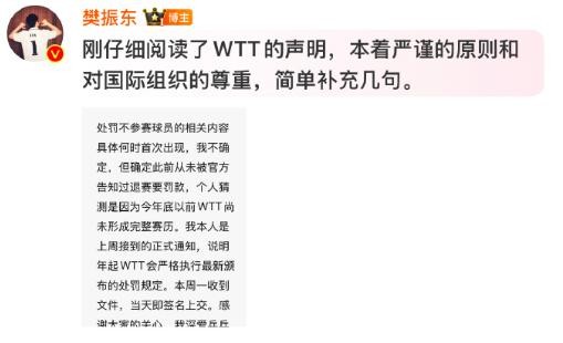 “个人猜测是因为今年底以前WTT尚未形成完整赛历。我本人是上周接到的正式通知,说明年起WTT会严格执行最新颁布的处罚规定。本周一收到文件,当天即签名上交。感谢大家的关心,我深爱乒乓球运动,也衷心祝愿国际组织越来越好。”