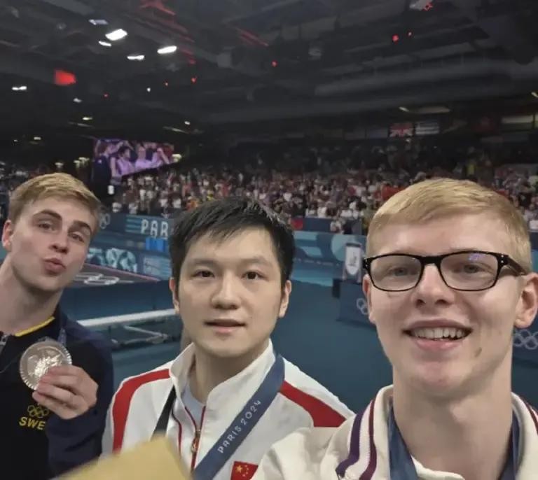樊振东(中)、莫雷加德(左)和F·勒布伦在巴黎奥运会上的合影。