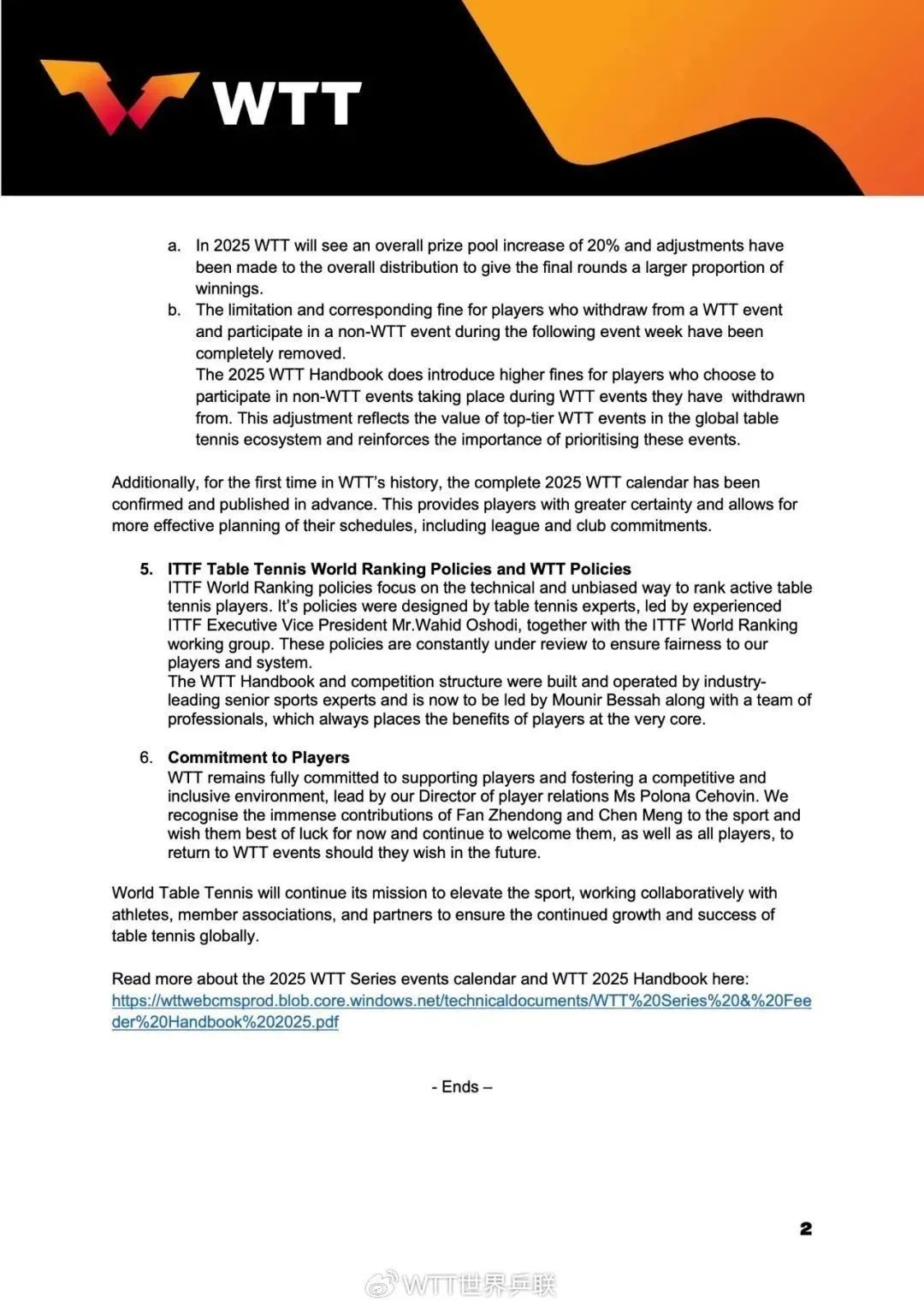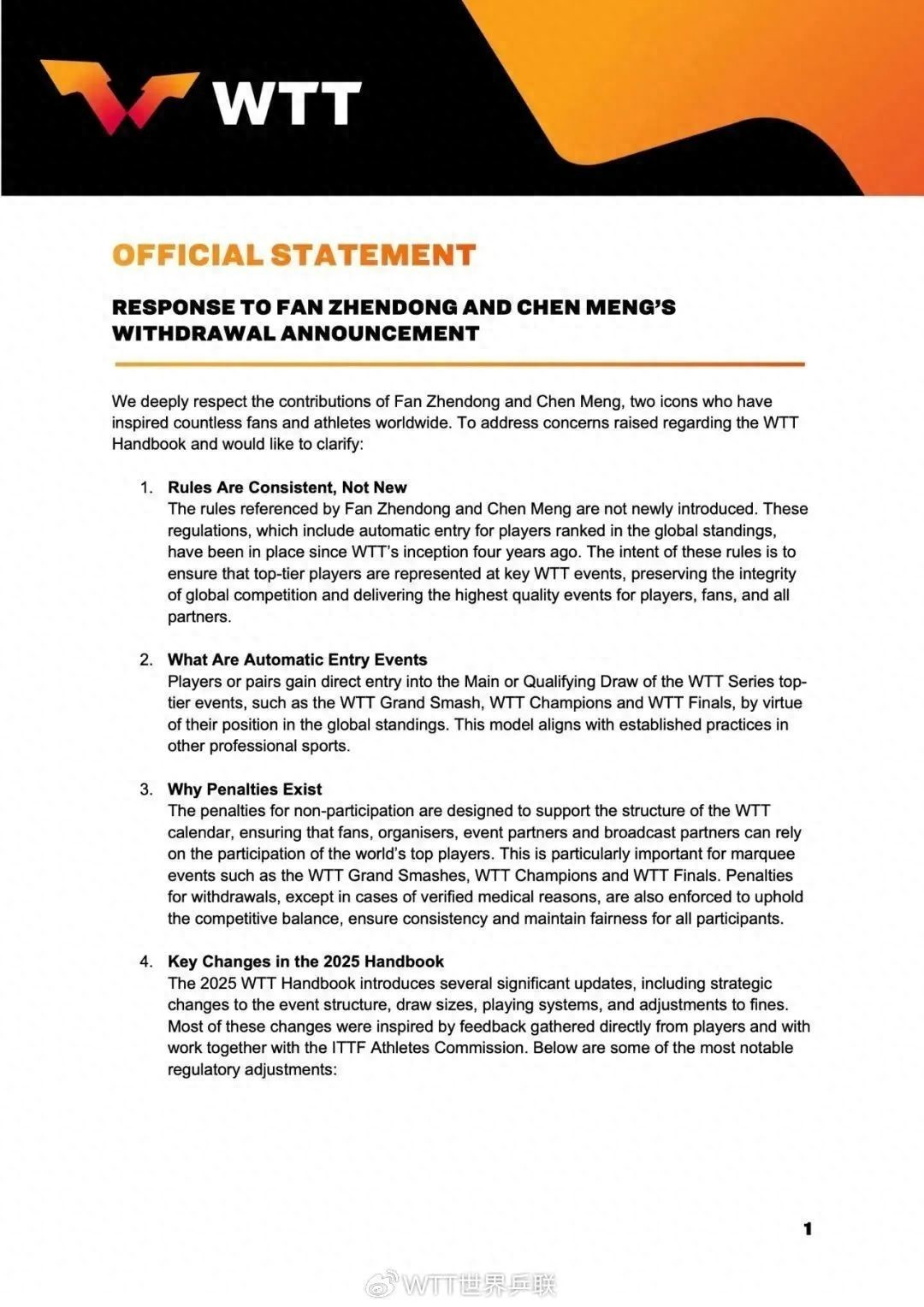 我们对樊振东和陈梦两位球员的贡献深表敬意,他们激励了全世界无数的球迷和运动员。针对就WTT手册提出的关切,我们希望澄清以下几点: