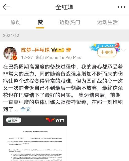 陈梦写道:“近期WTT最新出台的退赛罚款新规定,因身体目前还无法负荷每一次高强度赛事,出于对国际组织的尊重,已于周一签署文件,最终做出退出世界排名的选择。”多人发声此前,全红婵和潘展乐上线,分别点赞了陈梦和樊振东发表退出世排的博文。
