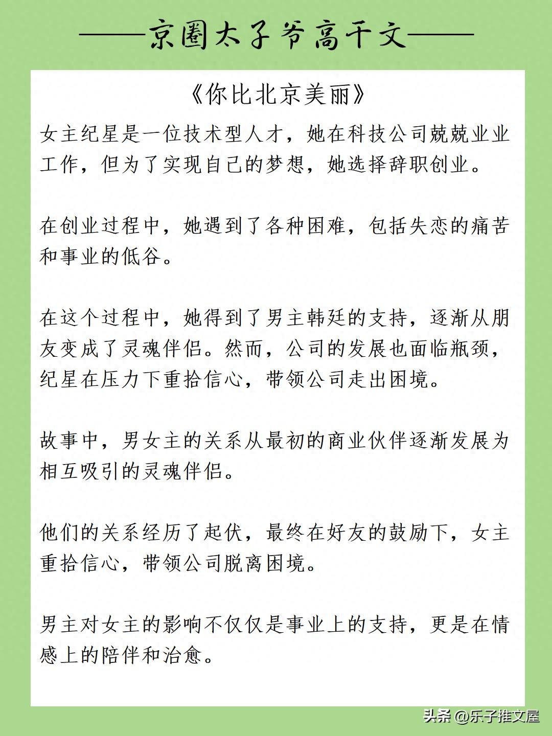 点评:《你比北京美丽》讲述了一个关于梦想与爱情的故事。这部小说的文笔细腻,情节真实,展现了主角在职场和生活中的成长过程。女主从职场小白逐渐成长为女强人,而男主的成熟和稳重也为故事增添了许多温暖和治愈的元素。