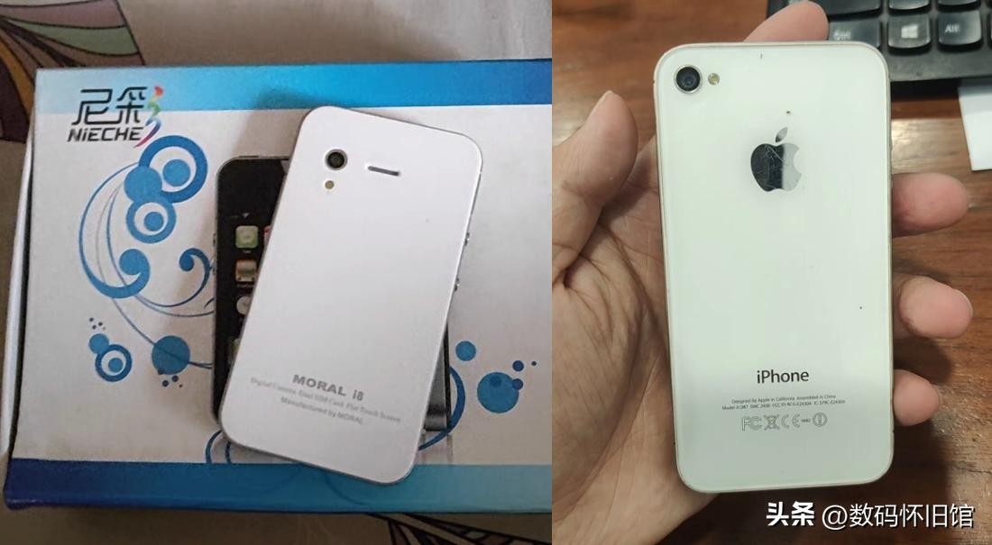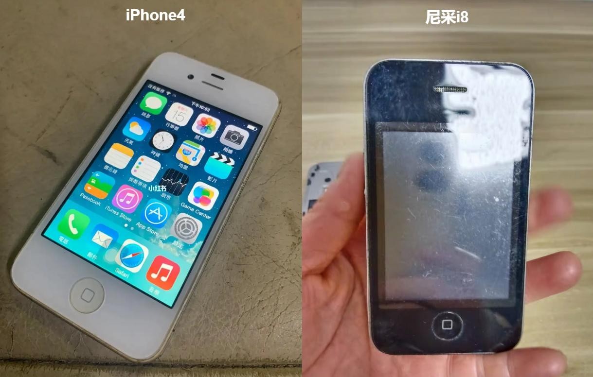 不过iPhone4采用的是不锈钢中框,无论质感还是强度都很好;而尼采i8用的是廉价的塑料中框,涂上银色冒充金属中框,质感只要一眼就能看出差距。而且除了按键,其他孔位都不一样。
