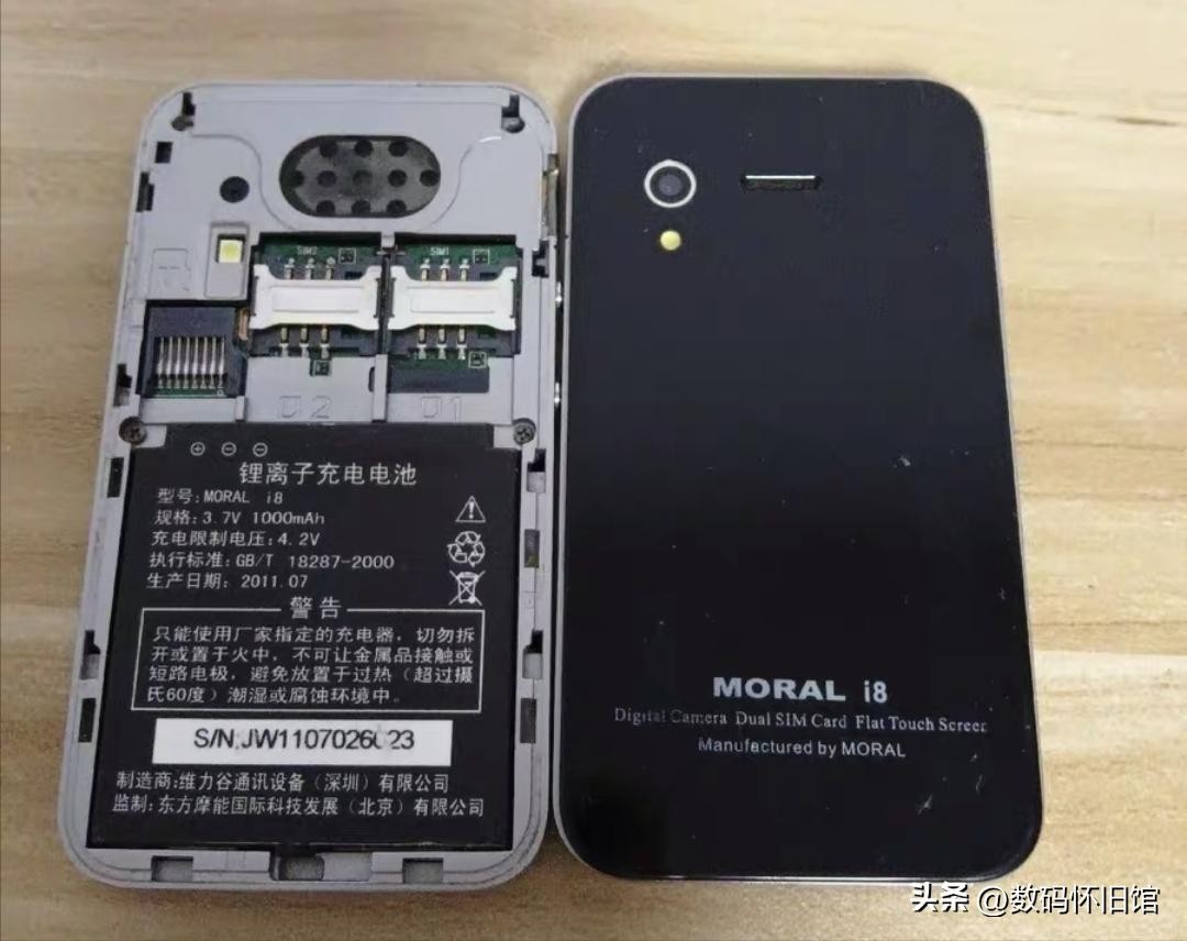 其次iPhone4采用的是玻璃后盖;而尼采i8采用的是塑料后盖,而且还是可以拆卸电池设计(这一点领先iPhone),拆开后盖映入眼帘的就是这块山寨电池,电池容量1000mah,而且还支持山寨机标配的双卡双待,还支持内存卡扩展。