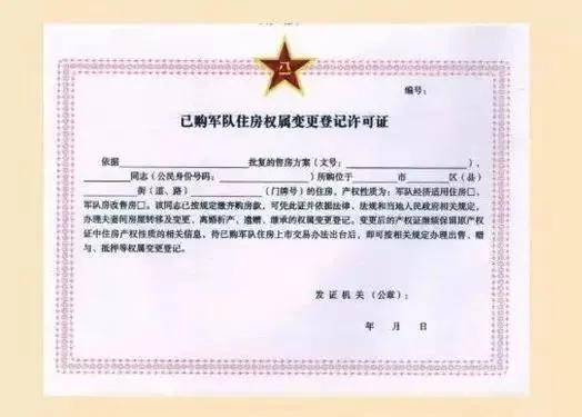 “符合出售条件的住房,购房人足额补交售房款后,由军队统一核发《已购军队住房权属变更登记许可证》,可按规定办理房屋继承、遗赠、夫妻间房屋转移及变更、离婚折产的权属变更登记。”