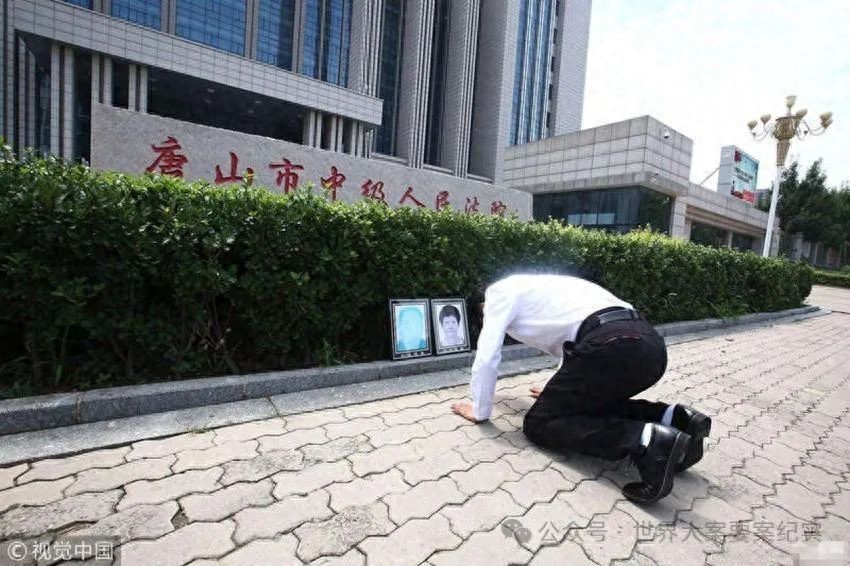 廖海军将父母的照片放在唐山中级人民法院的花坛边,恭恭敬敬的磕了三个头,告诉他们法院宣判的结果,以告慰两位冤死老人家的在天之灵。