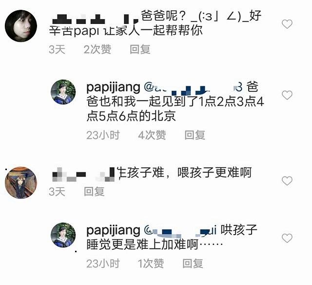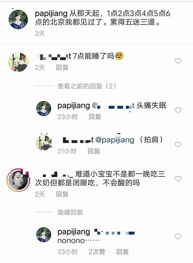 网易娱乐4月23日报道 网红papi酱在3月4日发文宣布自己成功“卸货”母子平安,一时间收获祝福满满。近日,papi酱陆续在社交平台上分享自己艰难的带娃日常,她表示哄孩子睡觉太难了,从生下孩子后,自己和老公就见到了凌晨1点、2点、3点、4点、5点和6点的北京,直言“累得五迷三道”。好不容易能熬过了6点之后,自己却是因为头疼加失眠仍然难以休息好。
