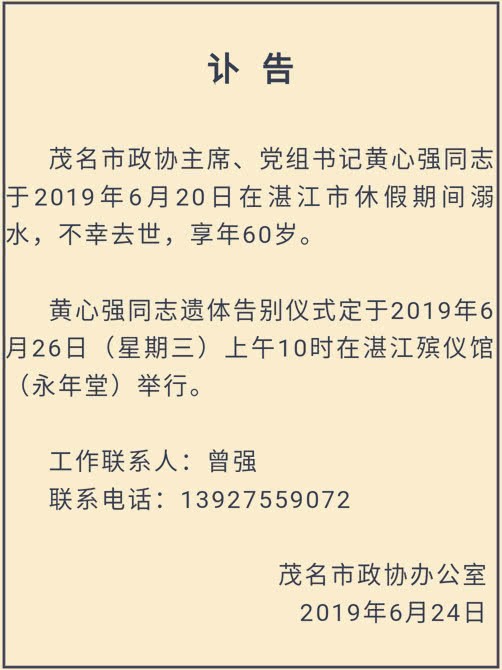 6月24日,广东茂名市政协办公室发布讣告称,茂名市政协主席、党组书记黄心强同志于2019年6月20日在广东湛江市休假期间溺水,不幸去世,享年60岁。
