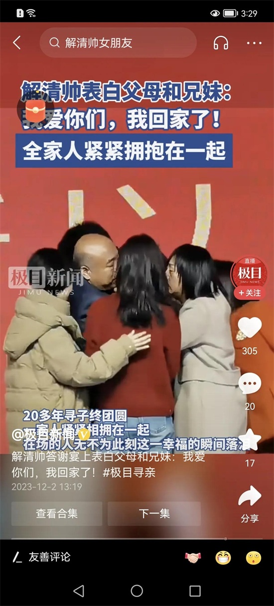 看到这个画面,有的网友说如果这是一个普通家庭,这孩子能有这么快的接受度吗;有的网友对第一个走上台拥抱的解清帅哥哥表示称赞,说这哥哥一看就是好哥哥;也有网友说回家真好,我也想回家;有的网友很感动,说看了多少遍,眼泪流了一遍又一遍;更多的网友表示祝福,祝贺家庭大团圆。