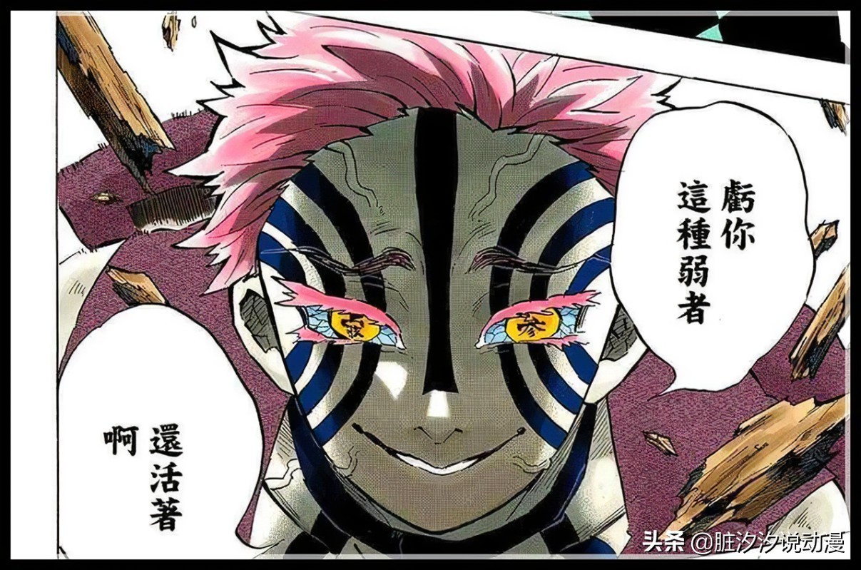 三哥首次出场于无限列车篇,四招击败炎柱——炼狱.杏寿郎(大哥可能会死,但是绝对不会输!!!)。在无限城中同时对战富冈义勇和炭治郎不落下风,甚至最后化身为最终形态,掌握了无惨的境界,即使头颅被砍掉也不会受到致命伤。这样的战绩,可以说已经达到了极为可怕的水平。只是最终死于剧情杀,找回记忆后选择消逝在天地间。