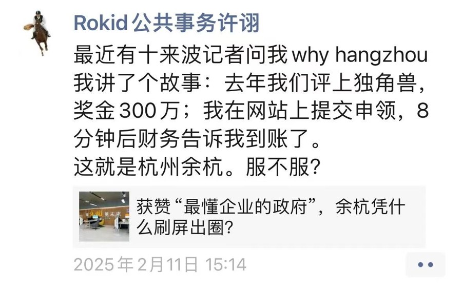 在接受记者采访后不久,许诩在自己的微信朋友圈里又一次讲述了这个故事。文末他这样写道:这就是杭州余杭。服不服?