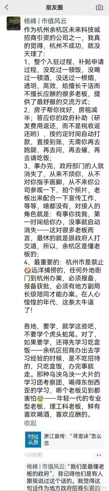 杨峰,作为证券研究机构市值风云的创始人和CEO,其公司总部设在北京,但在余杭区未来科技城设立了分公司,专注于APP和数据模型的研发维护。1月31日一整天,杨峰发了一条朋友圈。他转发了微信公众号“浙江宣传”的一篇文章,并配上了大段文字。当天,他的这条朋友圈便以截图的形式开始在互联网上疯传。在这段文字中,杨峰开宗明义:我真的觉得,杭州不成功,就没天理了。