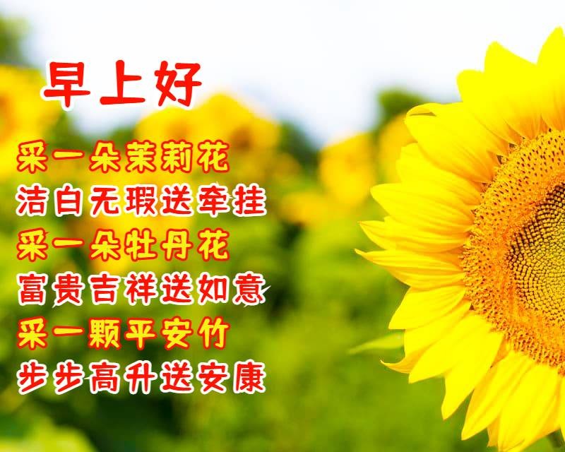 4、早上好!采一朵茉莉花,洁白无瑕送牵挂,采一朵牡丹花,富贵吉祥送如意,采一颗平安竹,步步高升送安康,采一颗开心果,开心快乐顺心意,祝你一生快乐。