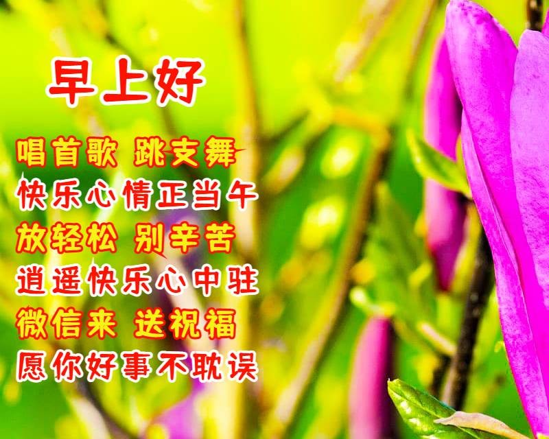 2、早上好!唱首歌,跳支舞,快乐心情正当午;放轻松,别辛苦,逍遥快乐心中驻;微信来,送祝福,愿你好事不耽误!