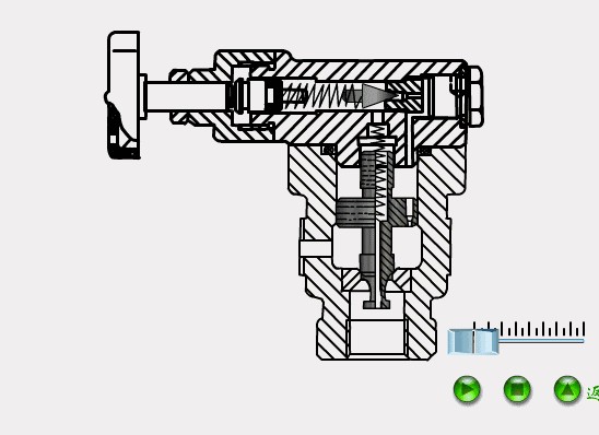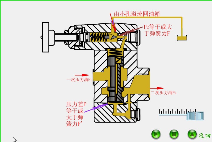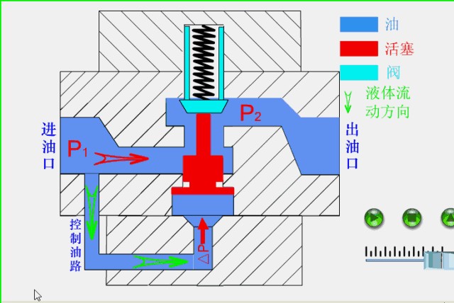 压力油从入口进入到主阀活塞下腔,对活塞产生一个向上的力,此时压力小于先导阀芯弹簧力; 油通过阻尼孔进入到活塞上腔,对活塞产生一个向下的力。 当先导阀芯没有被打开前,活塞上下面积相同,压强也相等,因此对活塞产生的力平衡,加上主阀芯弹簧对活塞有向下的力,所以主阀关闭。溢流阀入口压力不断增大,当油压力大于先导阀芯设定的压力时,先导阀芯打开。主阀上腔的压力油通过先导阀排走,上腔压力变为0。由于上腔压力0,在下腔油压力的作用下,主阀向上移动,打开阀芯,入口的压力油通过主阀芯流入排油口,降低入口油的压力。当入口油压力下降到低于先导阀设定的压力时,先导阀芯关闭,在主阀上腔重新建立了压力,推动主阀芯向下移动,关闭主阀。