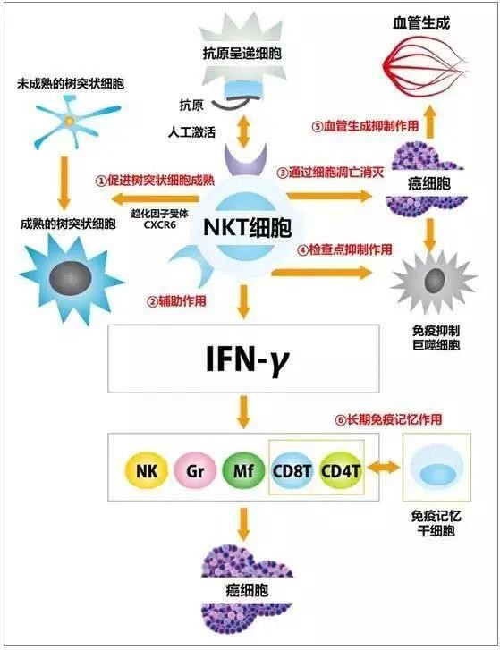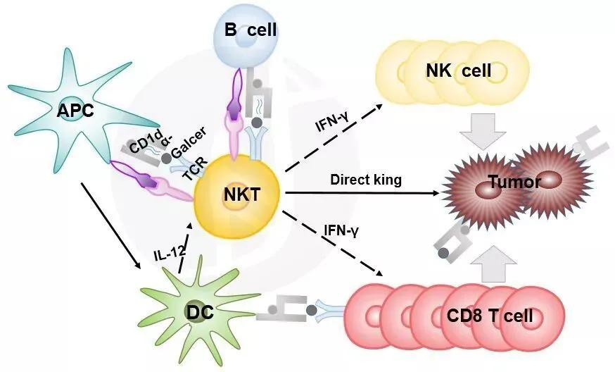 NKT细胞是先天性免疫和获得性免疫之间的“桥梁系统”,在感染后的前2或3天,NKT细胞对自身配体的微弱反应被树突状细胞衍生的白细胞介素-12放大,以响应微生物产物的TLR激活,从而产生干扰素-γ用于抗病毒、抗肿瘤及免疫调节,激活的NKT细胞是机体启动病原体特异性免疫反应所必需的。