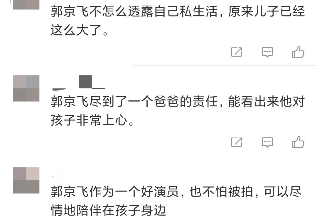不少网友看了之后纷纷评论,“郭京飞作为一个好演员,也不怕被拍,可以陪伴在孩子身边。”,“郭京飞尽到了一个爸爸的责任,能看出来他对孩子非常上心。”,“郭京飞不怎么透露自己的私生活,原来儿子已经这么大了。”