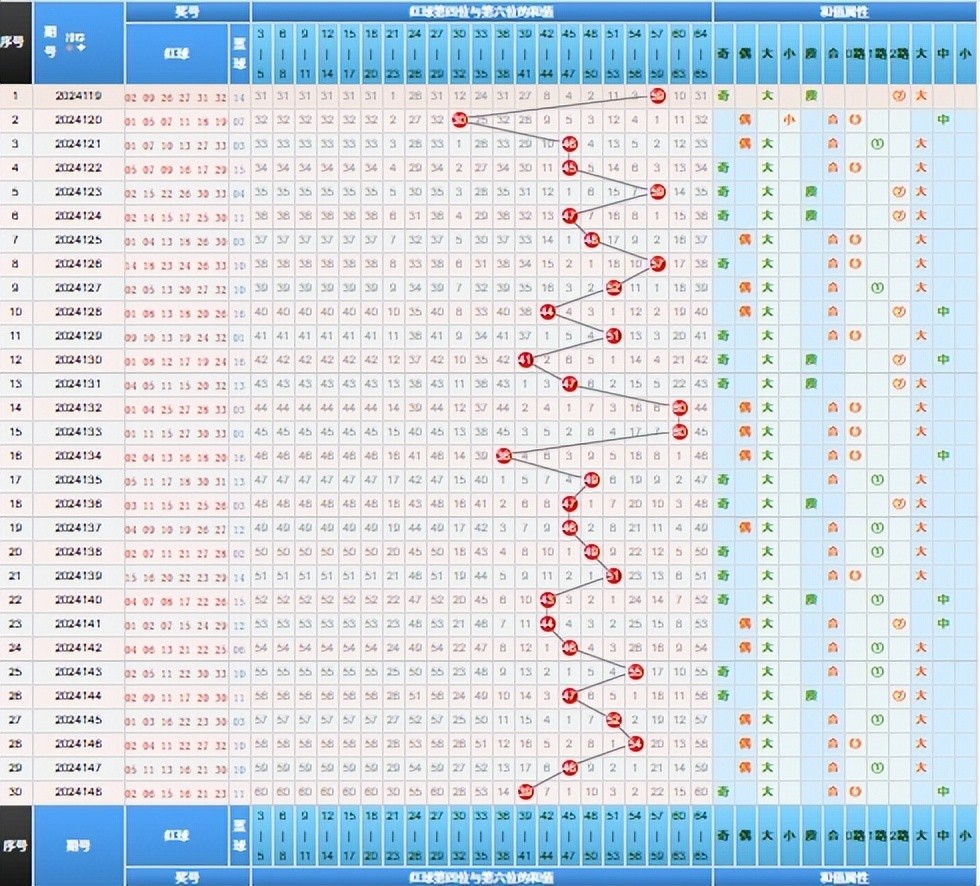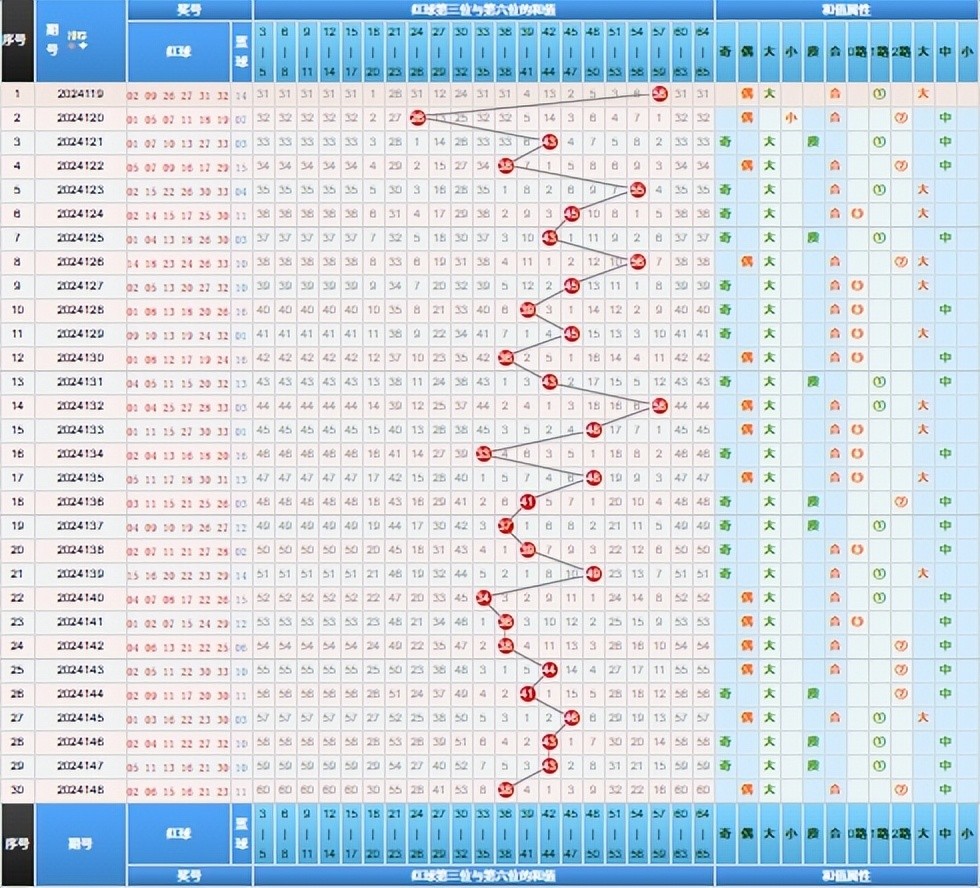 和值奇偶分析:最近10期的和值奇偶比为6:4,其中偶数和值稍显冷。本期可能会回补偶数和值。