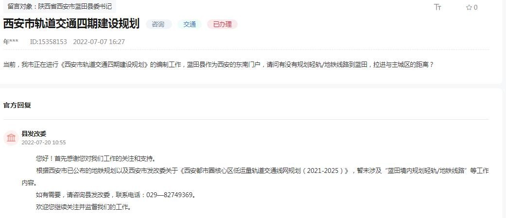 百理君注意到,7月20日蓝田县发改委在回复网友咨询时明确提到一个细节——西安市发改委已制定《西安都市圈核心区低运量轨道交通线网规划(2021-2025)》。