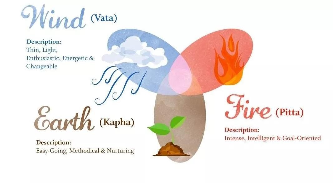 正如中国的中医里会把人划分不同体质一样,阿育吠陀认为我们的身体都是由五大元素(土、水、火、风、空)以不同比例组成的,而由这五种元素所构成的能量被称之为Dosha。这种能量又被分成三种类型:Vata(风型),Pitta(火型),Kapha(土型),这些是决定人的体态、体质、性格的重要因素。
