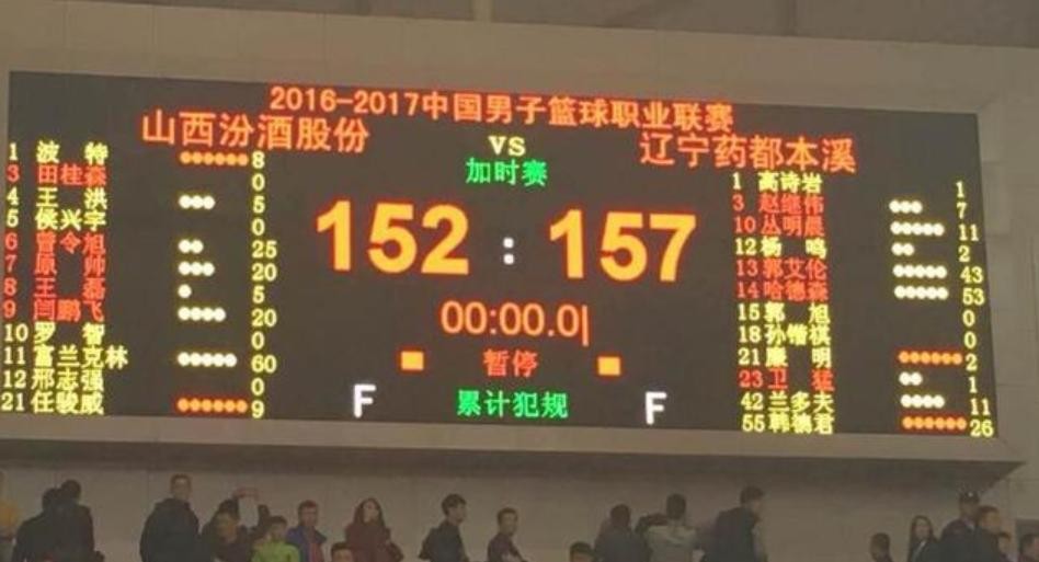 2016-17赛季CBA常规赛辽宁队大战山西队,辽宁队在客场经过三个加时赛,最后157-152战胜了s山西队。