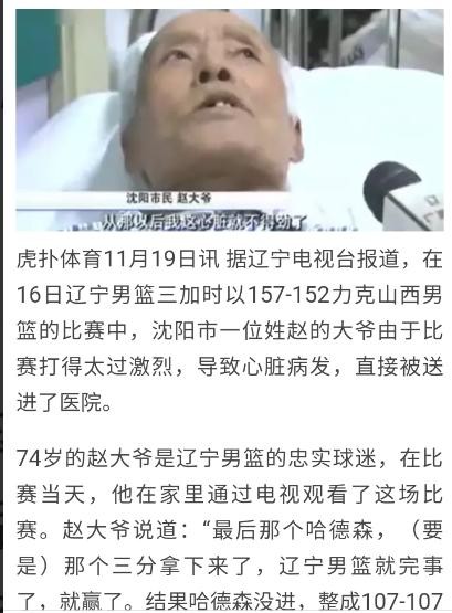 这场比赛有多激烈,看赛事周边新闻就知道了,辽宁队的老球迷差点被哈德森抬走了。74岁的大爷,看比赛太激动,都进医院了。