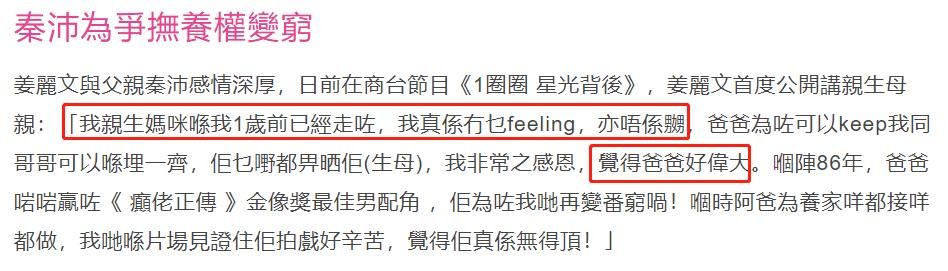 2月11日,据港媒报道,秦沛女儿姜丽文接受了电台节目的专访,罕见谈及生母。