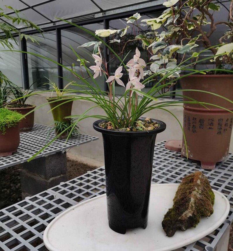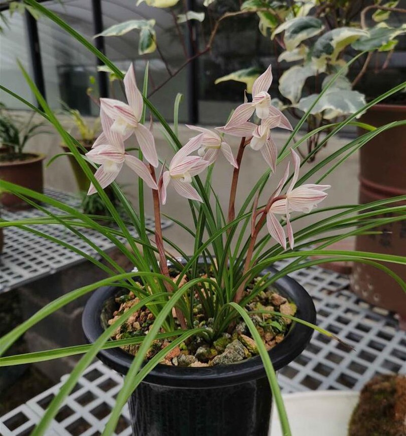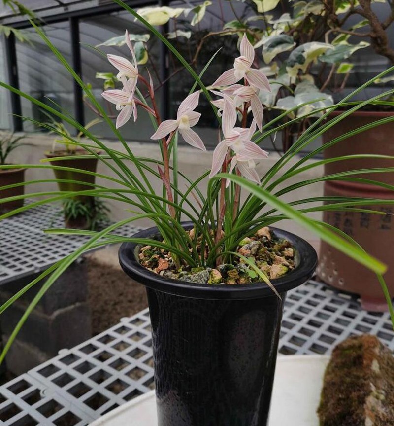 莲瓣兰花萼呈三角披针形,花瓣短而宽并向内曲,犹似荷花的花瓣形状,便以花喻花,称之为"莲瓣兰″。叶多弓垂弯曲,也有斜立和直立叶态品种。叶色浓绿或黄绿,有光泽,叶脉明亮而无叶柄环。株叶一般为四至八片,最多不超过十二片。宽零点四至零点六厘米,长三十至八十厘米。叶芽伸出基质2至3厘米时,有20余天的缓长期。也有宽叶细叶长叶和矮叶品种之别。在国兰中叶片是最窄的品种。比春兰叶略窄一点,却比春兰叶长得多。假鳞茎在七类国兰中是最小的和蕙兰的差不多。