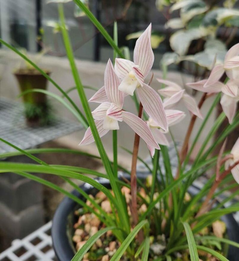 莲瓣兰于九月份形成花芽,十二月份抽出花莛,翌年1月份始花,2月至3月中旬盛,花三月下旬未花,花期长达月余。杆高20至40厘米花3至5朵,花径为4至6厘米。花以白色为主,略带红,黄,绿或紫色。萼片呈三角披针形,花瓣短而宽,向内曲。多数有不同深浅的红色脉纹和斑点。