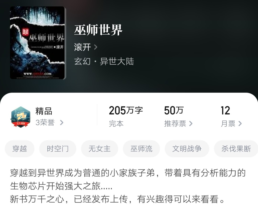 短评:巫师流的开山之作,最为经典的巫师流小说,成绩在起点正版订阅达到了万订以上,不可多得的佳作!滚开真正的写出了和以往不同的巫师世界,这是一群极端冷静自私残忍的研究狂,有着极为旺盛的求知欲,通过研究未知来提升自己,哪怕这有可能会让自己步入深渊。